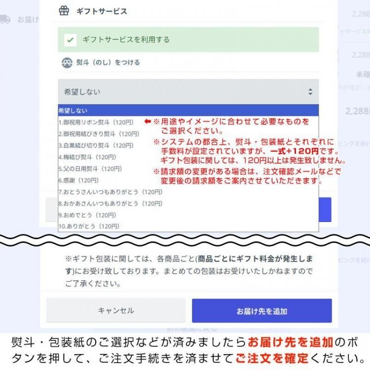 ・受取希望日・時間などは、ご注文お手続き画面の配送希望日・配送時間帯などで指定いただくか備考欄に希望の日時をご記入ください。